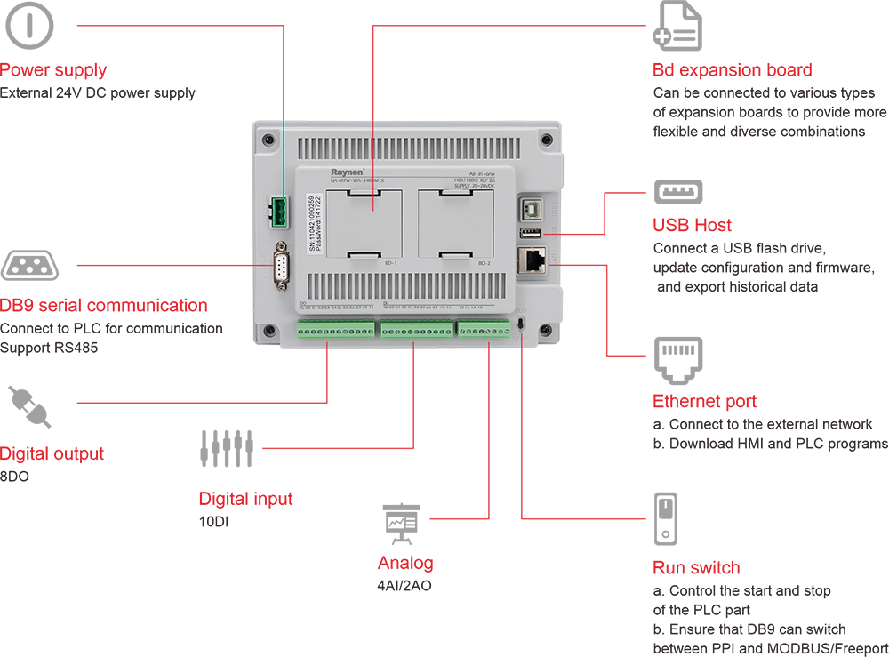 | | • Støtter industrielle Internett-funksjoner og kan fjernstyres; • Nettverksporten kan laste ned HMI- og PLS-programmer direkte for enkel nedlasting; • Hoveddelen støtter digitale og analoge mengder, som kan velges deretter. • Støtter 2 BD-utvidelsesversjoner for fleksibel tilpasning til ulike behov på stedet; • PLS-delen bruker programmering i japansk stil |