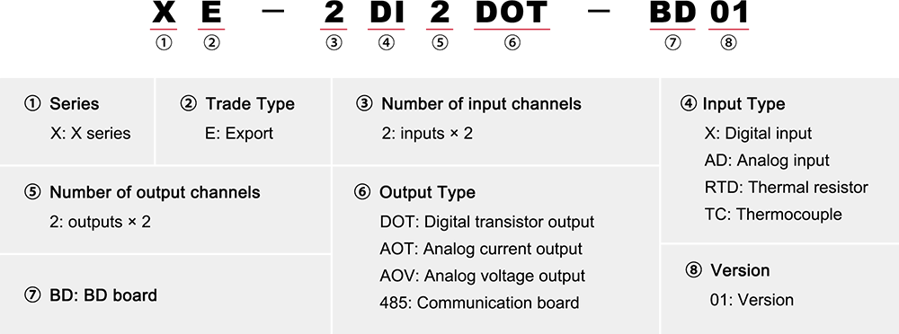 | 5 | XE-2RTD-BD | Termiske motstander ×2, støtter PT100 | RTD-innganger×2 |