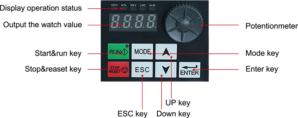 | Frekvensinnstillingssignal | Integrert betjeningspanel | Membranbryter (knapp), hastighetsknapp (potensiometer) |