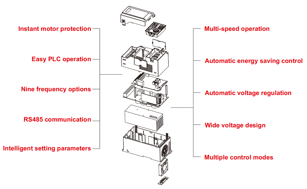 | Byttefrekvens | 1,5 kHz-12 kHz Den automatiske koblingsfrekvensjusteringsfunksjonen kan stilles inn: når temperaturen stiger, reduseres koblingsfrekvensen automatisk Når temperaturen går tilbake til normalen, går koblingsfrekvensen tilbake til utgangsverdien |