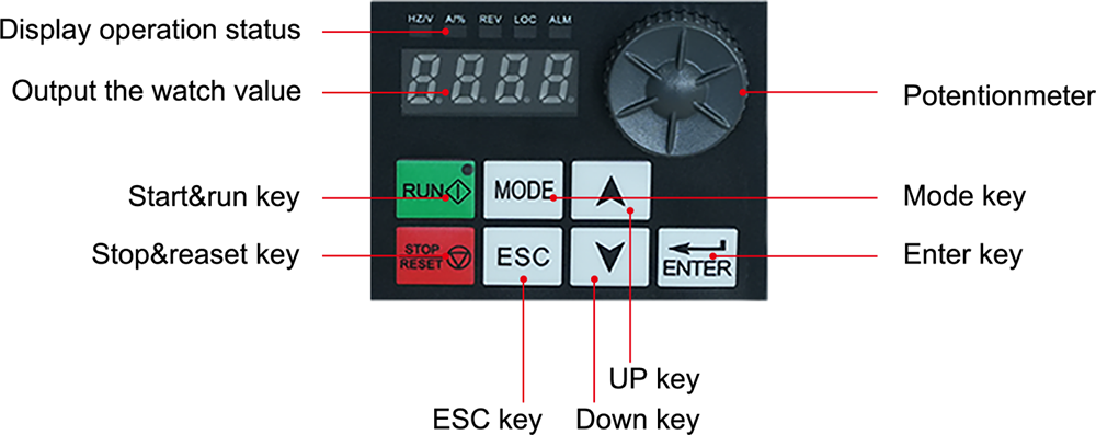 | Frekvensinnstillingssignal | Integrert betjeningspanel | Membranbryter (knapp), hastighetsknapp (potensiometer) |