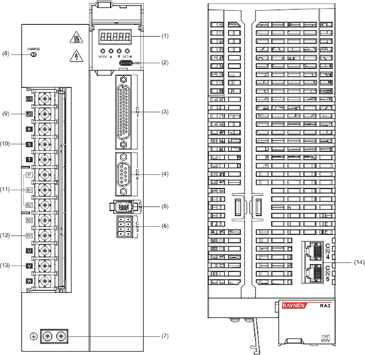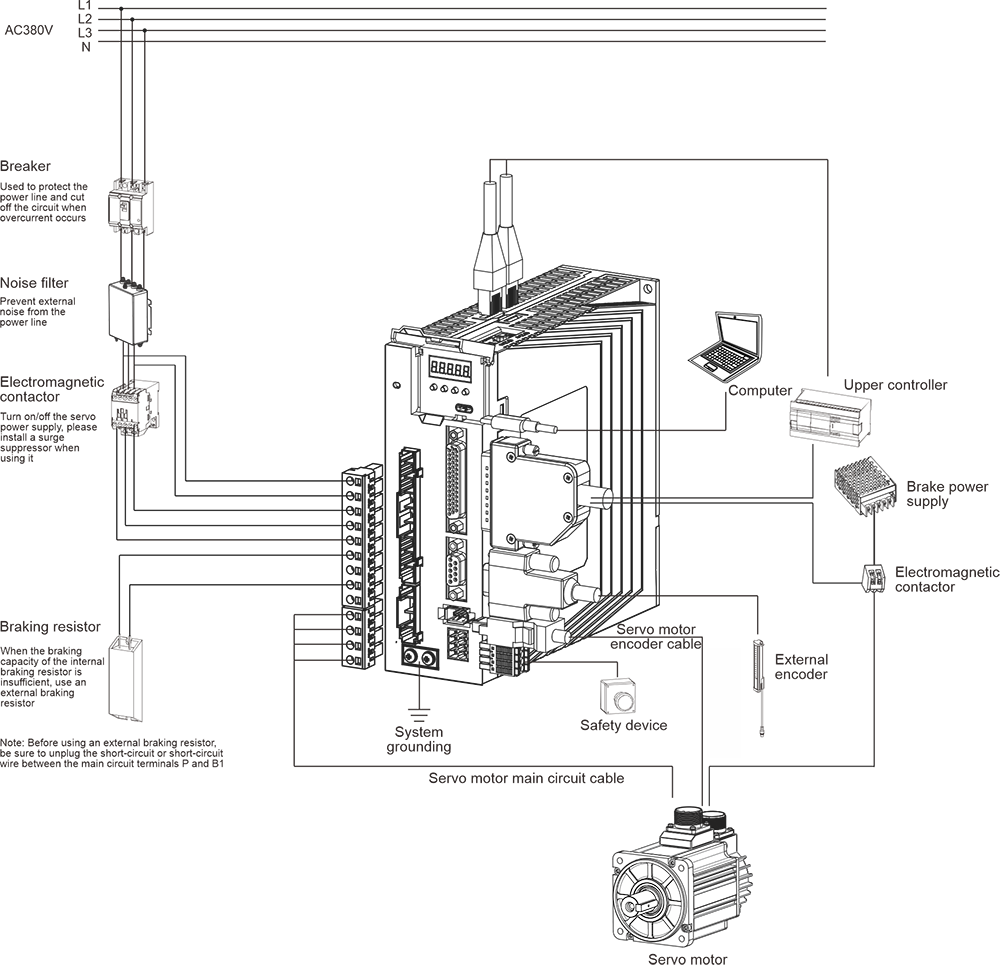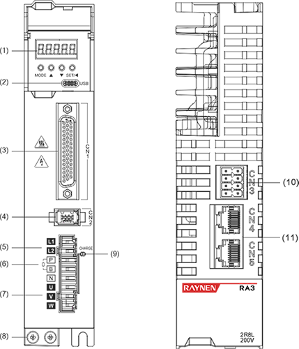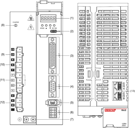 | Beskrivelse: ① Digital rørskjerm: 5-sifret 8-segment LED digitalt rør ②USB: USB Type-C-grensesnitt, koblet til PC ③CN1 (grensesnittkontakt): utgangs-/inngangssignaltilkoblingsport, koblet til programmerbar kontroller (PLC) eller kontroll-I/O ④Fullt lukket sløyfe-koderkontakt: helt lukket sløyfe-grensesnitt, koblet til ekstern andre koder, '-FS'-modellen støtter denne funksjonen ⑤CN2 (koderkontakt): kodergrensesnitt, koblet til koderen på servomotoren ⑥L1, L2, L3 (hovedstrøminngangsterminaler): hovedkretsstrømforsyning, enfaset strømforsyning er koblet mellom L1 og L2 (200~240VAC, 50/60Hz strømforsyning) ⑦L1C, L2C (kontrollstrøminngangselektronikk): strømforsyning for styrekrets, koblet til enfaset strømforsyning (200~240VAC eller 380~440VAC, 50/60Hz strømforsyning i henhold til modellen) ⑧R, S, T (hovedstrøminngangsterminaler): Hovedkretsstrømforsyning, koble til trefasestrømforsyning (200~240VAC eller 380~440VAC, 50/60Hz strømforsyning i henhold til modellen) ⑨P, B (tilkoblingsterminal for ekstern bremsemotstand): bruk ekstern bremsemotstand ⑩P, B1, B2 (tilkoblingsterminal for ekstern bremsemotstand): bruk ekstern bremsemotstand (fjern kortslutningsstykket mellom P og B1, koble til begge ender av P og B2) ⑪P, N (N1, N2) (servobussterminal): ikke fjern kortslutningsstykket mellom N1 og N2, koble mellom P og N (N1) for at flere servoer skal dele DC-bussen ⑫N1, N2: koble til ekstern DC-reaktor (fjern kortslutningsstykket), kortslutt når den ikke er i bruk ⑬U, V, W, PE (servomotortilkoblingsterminal): servodrivutgang, koblet til motorstrømkontakten (U, V, W, PE) ⑭ Jordingsskrue: Koble til strømjord og motorjord ⑮CHARGE (busspenningsindikator): strømindikator ⑰CN3 (kontakt for sikkerhetsfunksjon): STO-grensesnitt, kun '-S/FS'-modeller støtter denne funksjonen ⑱CN4/CN5 (kommunikasjonsterminal): 485 kommunikasjonsport, EtherCAT høyhastighets kommunikasjonsport, CAN kommunikasjonsport | |||||||||