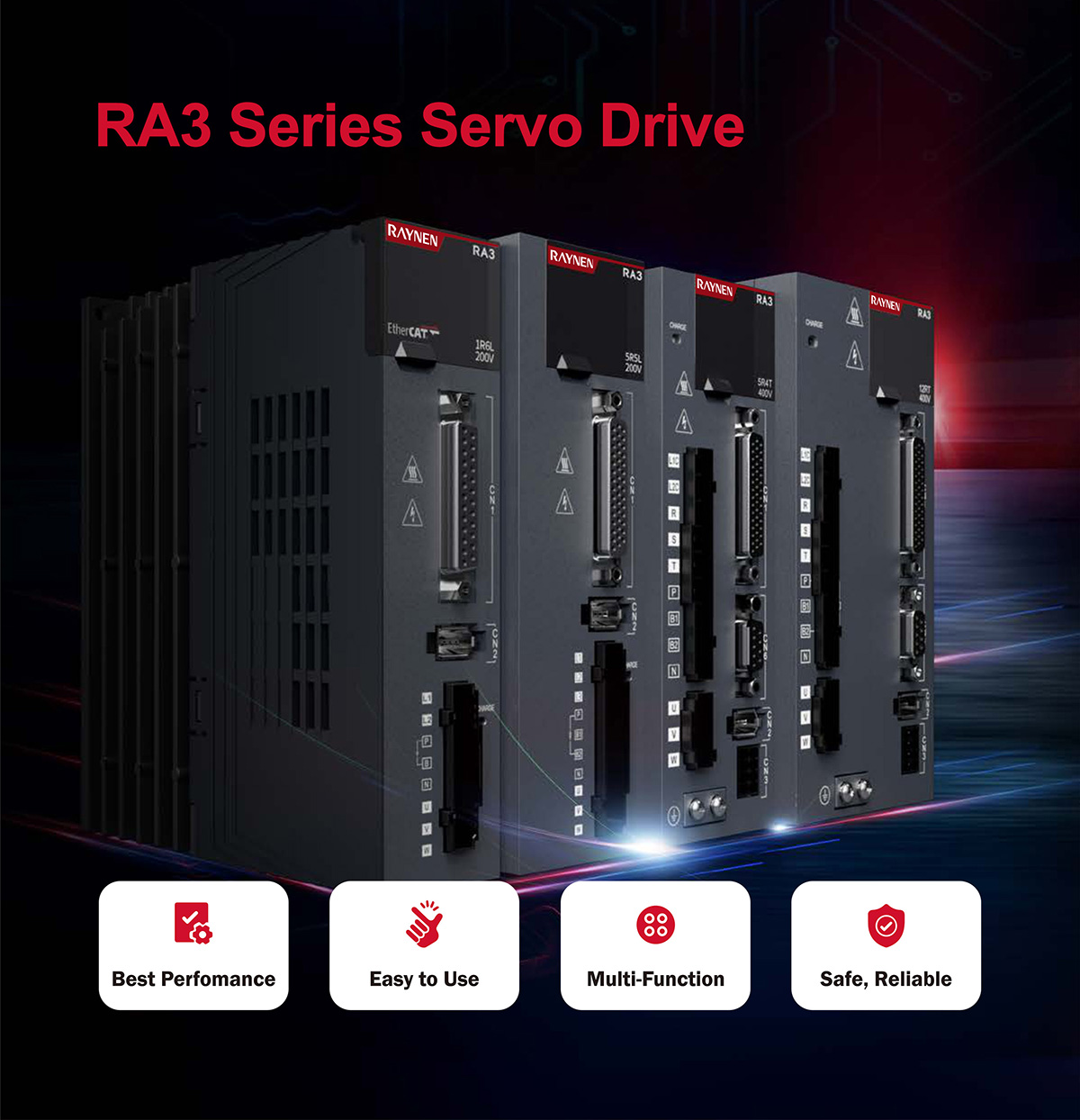 | Effektområde fra 100W til 7,5KW Støtter puls, analog, EtherCAT og CANopen | |