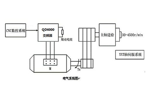 | 04 Systemintroduksjon: I dette systemet drives 4KW CNC-maskinspindelen av RVE32 5,5KW-omformeren, og rask bremsing og stopp realiseres gjennom den eksterne bremseenheten og bremsemotstanden. Hastighetsvariasjonen forårsaket av lastendringen er svært liten av vektorkontrollen med åpen sløyfe. | | ||||||||||||||||||